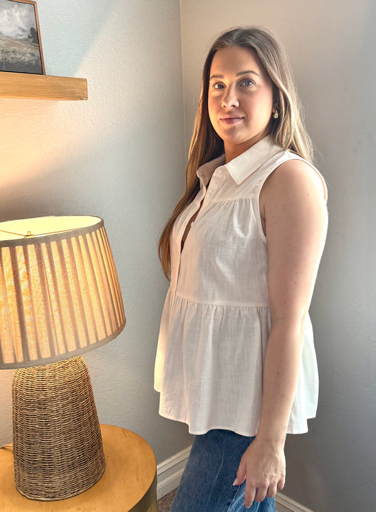 Peplum Sleeveless White Button Up Shirt