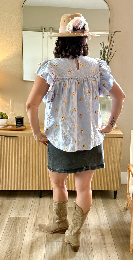 Embroidered Ruffle Sleeve Blue Top