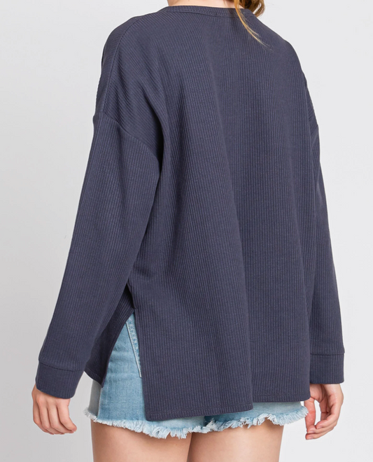 GRAPHITE HENRY NECK BUTTON DOWN SIDE SLIT DETAILED LONG SLEEVE TOP