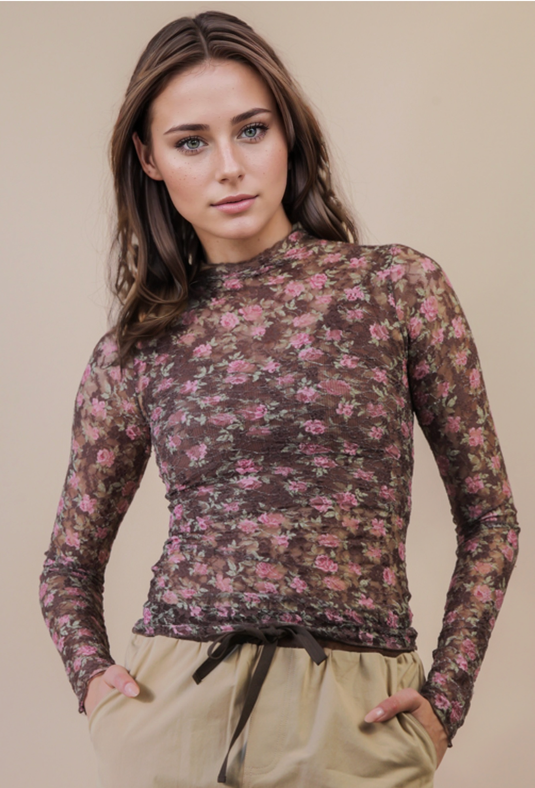 Chocolate Floral Sheer Mesh Lace Knit Top