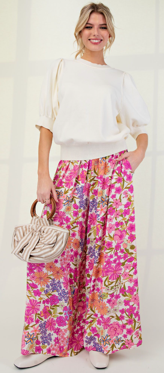Embrace the new season in style with our Spring Floral Challis Palazzo Pants. Made from lightweight and flowy fabric, these pants feature a beautiful floral print. The loose and wide-legged silhouette not only offers a comfortable fit but also gives off a trendy and chic vibe. Perfect for any spring occasion, these pants are a must-have in your wardrobe.